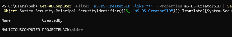 Get-ADComputer -Filter 'mS-DS-CreatorSID -like "*"' -Properties mS-DS-CreatorSID | Select-Object Name, @{N='CreatedBy';E={(New-Object System.Security.Principal.SecurityIdentifier($($_."mS-DS-CreatorSID"))).Translate([System.Security.Principal.NTAccount]).Value}}It looks like alice has been up to something in our lab.